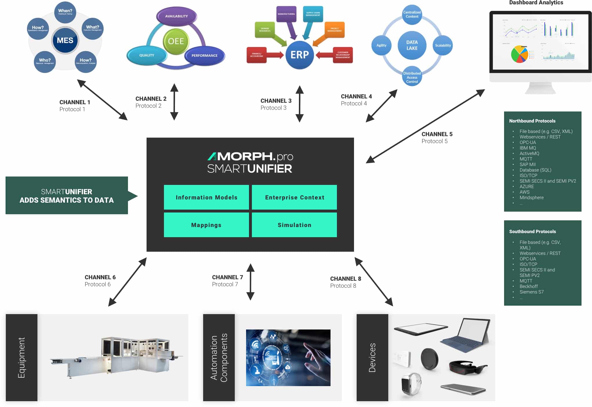 Amorph Systems is a leading developer of software technologies and products in the field of industrial connectivity. For industrial IT applications, Amorph Systems provides its powerful and fully decentralized SMARTUNIFIER Connectivity Platform. With SMARTUNIFIER, customers are able to acquire any kind of production data from a large assortment of shopfloor equipment devices and IT-Systems and make them usable in a variety of ways. SMARTUNIFIER collects the raw data locally at the Edge, enriches it with full semantics, transforms it as required, and pushes it instantly and securely into the Cloud. Capable of combining an extensive variety of communication protocols, SMARTUNIFIER builds the bridge between local shopfloor IT environments and the Cloud.